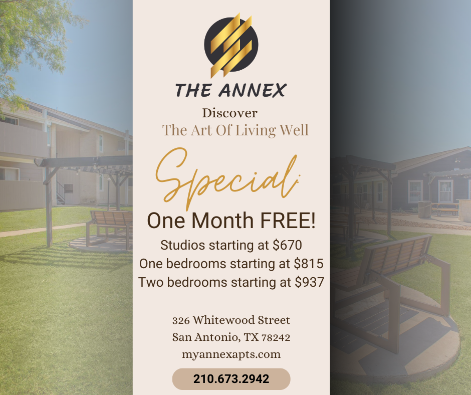 The Annex apartments in vibrant South San Antonio, TX boasts proximity to top-rated South San Antonio schools and several esteemed colleges. Immerse yourself in a diverse range of entertainment options, including bowling alleys, movie theaters, parks, and shopping hotspots, all just a short distance away. Pamper yourself at local salons and spas, and prepare for the bustling city life. Location is everything — and everything is bigger and better in Texas!